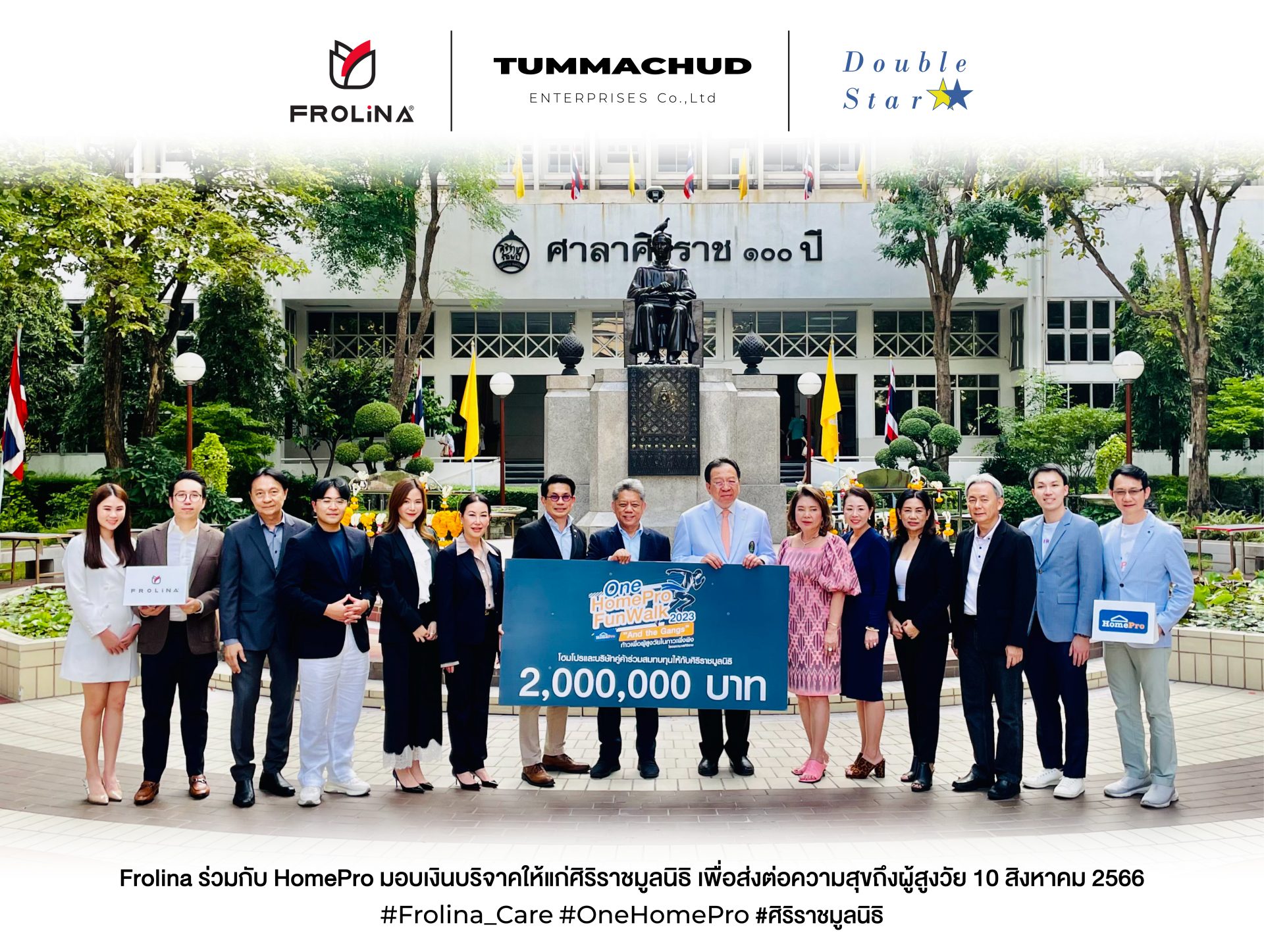 บริษัท ธรรมฉัตร เอ็นเตอร์ไพรส์ จํากัด หรือ ฟรอลิน่า (Frolina) ร่วมสมทบเงินบริจาคกับ บริษัท โฮม โปรดักส์ เซ็นเตอร์ จำกัด (มหาชน) หรือ โฮมโปร (Home Pro) และพันธมิตรคู่ค้าของโฮมโปร ในการมอบเงินบริจาคให้แก่ศิริราชมูลนิธิ เพื่อสนับสนุนกิจกรรม “One HomePro FunWalk 2023 ก้าวเพื่อผู้สูงวัยในภาวะพึ่งพิง โรงพยาบาลศิริราช” โดยการนี้ ฟรอลิน่า เพื่อเป็นทุนในการก่อสร้างศูนย์วิทยาการเวชศาสตร์ผู้สูงอายุระดับชาติ คณะแพทยศาสตร์ ศิริราชพยาบาล